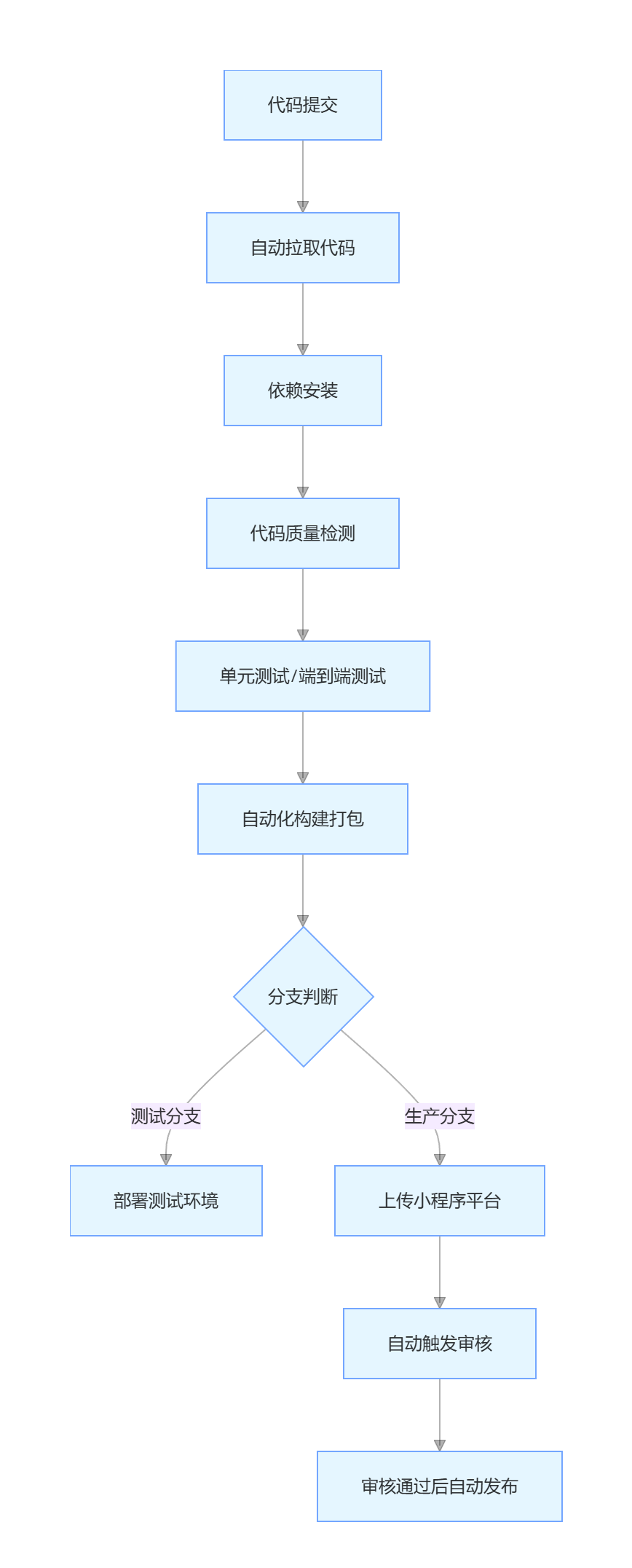 小程序开发自动化 CI/CD 流程的搭建,核心是通过工具链整合实现 "代码提交即部署",不仅提升开发效率,更能保障版本质量。在实际落地中,需结合团队规模、项目复杂度调整流程(如小型项目可简化分支策略,使用 GitHub Actions 替代 Jenkins)。